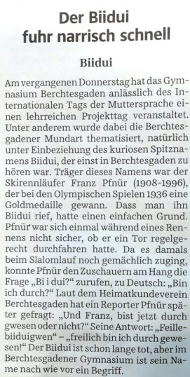 Wer der Biidui war, das wissen in Berchtesgaden die Einheimischen: Franz Pfnür aus der Oberau, Olympiasieger 1936 in der alpinen Kombination. Seit dem 25.2.2019 wissen es auch Leser der Süddeutschen Zeitung, denn dort hat Hans Kratzer einen Bericht geschrieben, über unsere Mundartund und eben den Biidui. Dass er dabei die Webseite des Heimatkundevereins zitiert, freut uns natürlich.