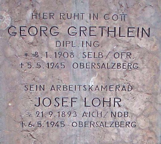 Nr. 49 Dipl. Ing. Georg Grethlein, 37 Jahre aus Selb, Betriebsführer der größten Baufirma am Obersalzberg, erhielt von der amerikanischen Militärregierung noch am Tag des Einmarsches den Auftrag, für Ruhe und Ordnung am Obersalzberg zu sorgen. Josef Lohr, sein Beifahrer aus Aich, wurde am Tag darauf von einem betrunkenen französischen Soldaten in den Bauch geschossen, an dessen Folgen er im Krankenhaus verstarb. Grethlein, der ihm zu Hilfe eilen wollte, erhielt einen tödlichen Kopfschuss. Laut kath. Sterbebuch (Nr. 97) verschied Lohr am 5. Mai um 20:00 Uhr, somit ist der Todestag, 6.5., auf dem einzig noch vorhandenen Grabstein nicht ganz richtig.