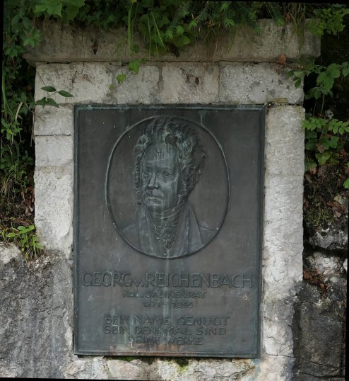 Das Denkmal für Georg von Reichenbach wurde 1927, ein Jahr nach seinem 100. Todestages, enthüllt. Die zentrale Bronzetafel wurde vom Bildhauer Anton Hiller aus München angefertigt, der auch den Marmorbrunnen im Hauptbrunnhaus der Alten Saline in Bad Reichenhall geschaffen hat. Die Denkmaltafel zeigt ein Portrait des königlichen Salinenrates, seine Lebensdaten, sowie einem Spruch. Dieser hatte den Anstoß gegeben, die nachträglich angebrachte Bronzetafel mit biographischen Angaben zu entfernen.