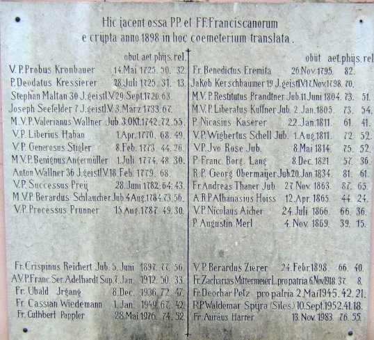 Die Grabplatte von Pater Franz Paula Puechner hat man offensichtlich erst danach gefunden. Wir wissen von diesem Ordensbruder aus der Geschichte des Franziskanerklosters, dass er, nachdem er Typhuskranke gepflegt hatte, selber an Flecktyphus erkrankte und 1741 starb (Bergheimat 1931, Seite 73).