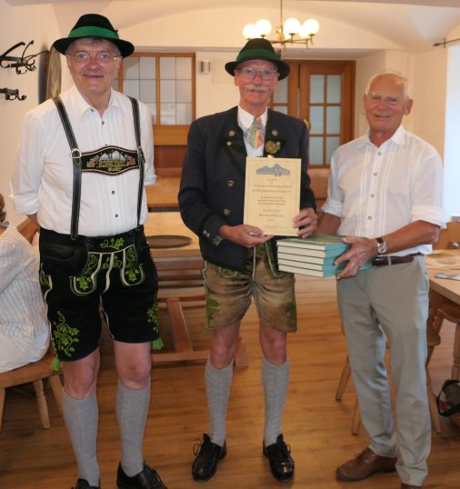 Alfred Spiegel-Schmidt und Gernot Anders haben Preis und Urkunde an Rudi Koller, den 1. Vorsitzenden der Vereinigten Weihnachtsschützen übergeben.