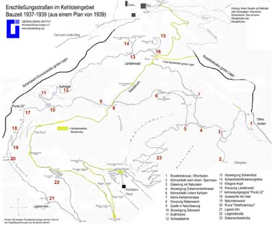 Zahlreiche Anfragen haben in letzter Zeit gezeigt, dass das historische Straßennetz um den Kehlstein bei der Bevölkerung der Region kaum in seinen gesamten Ausmaß bekannt ist. Das Obersalzberg Institut e.V. hat nun auf der Basis eines historischen Plans von 1939 eine farbige Gesamtkarte in Größe DIN A 3 hergestellt, die als PDF Datei auf dieser Website herunterzuladen ist bzw. in Berchtesgaden bei TeamWork erhältlich ist.