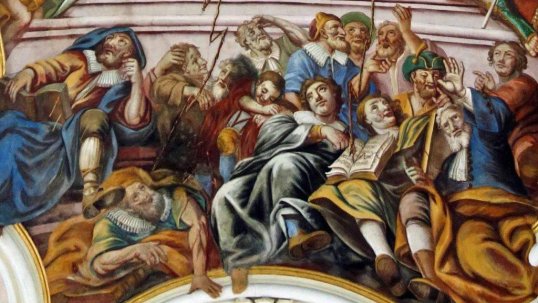 Zum Foto: Im unteren Feld des Deckengemäldes in Maria Kunterweg in der Ramsau ist eine Andacht von Protestanten zu sehen. 13 Lutheraner folgen in zwei Lutherbibeln den Auslegungen ihres Predigers am rechten Bildrand. Diese Andacht wurde durch zwei Blitze jäh unterbrochen.
