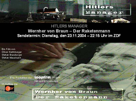 Unter dem Titel "Hitlers Manager" stellen die OI-Gründungsmitglieder Oliver Halmburger (Loopfilm GmbH, München) und Stefan Brauburger (ZDF, Mainz) die Geschichte des Wernher von Braun in der Sendung "Der Raketenmann" vor. Die Dokumentation ist im ZDF am 23.11.2004 ab 22.15 Uhr zu sehen. An den Recherchen zum Film war maßgeblich auch OI-Mitglied Thomas Stähler beteiligt.